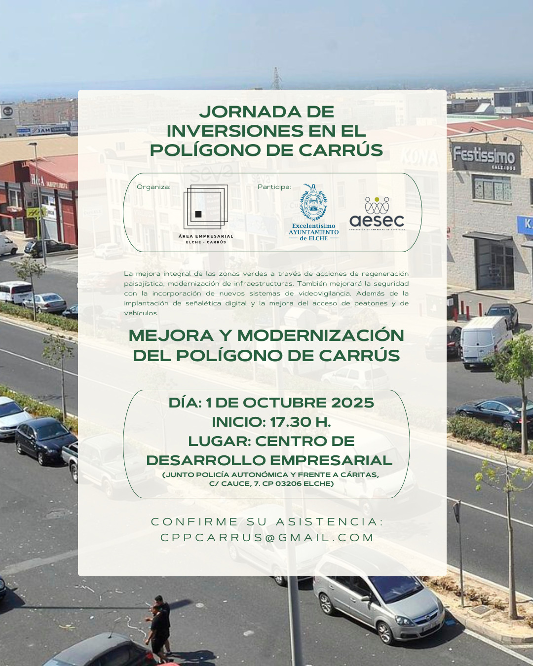 El próximo 1 de octubre de 2025 se celebrará en Elche una jornada dedicada a la mejora y modernización del Polígono de Carrús, una de las áreas empresariales más importantes de la ciudad. El encuentro, organizado por el Área Empresarial Elche-Carrús con la participación del Ayuntamiento de Elche y la Asociación de Empresas de Servicios de Elche y Comarca (AESEC), tendrá lugar a las 17:30 horas en el Centro de Desarrollo Empresarial, situado en la calle Cauce, 7.